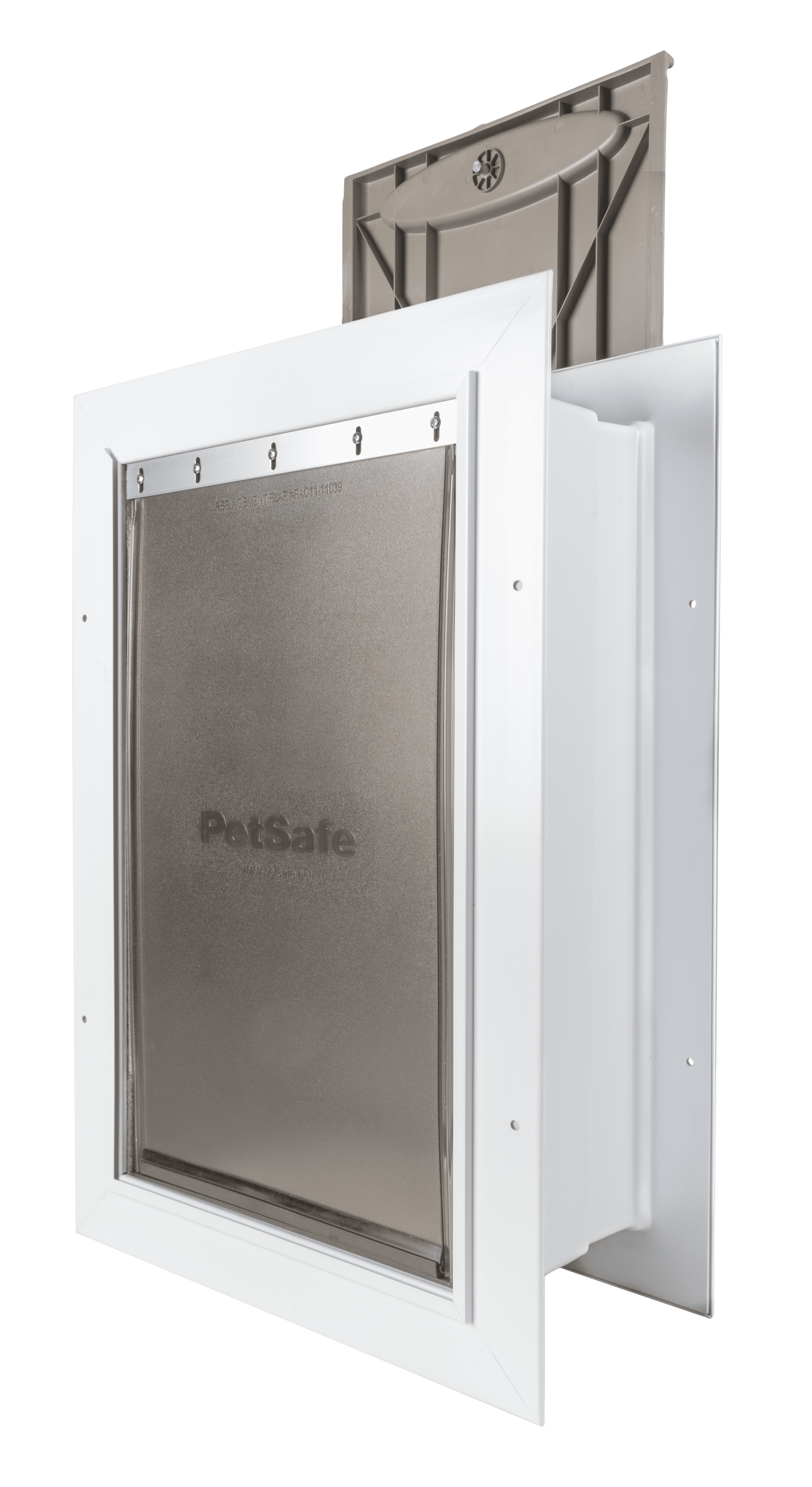 The Dual Flap design (one inside and one outside) makes for a well insulated barrier between the outdoors and your indoor room. This Dog Door can be used in a variety of wall materials including all types of siding, stucco, even brick. Installation requires only a few tools. The Wall Pet Door from PetSafe has a lifetime limited warranty.
