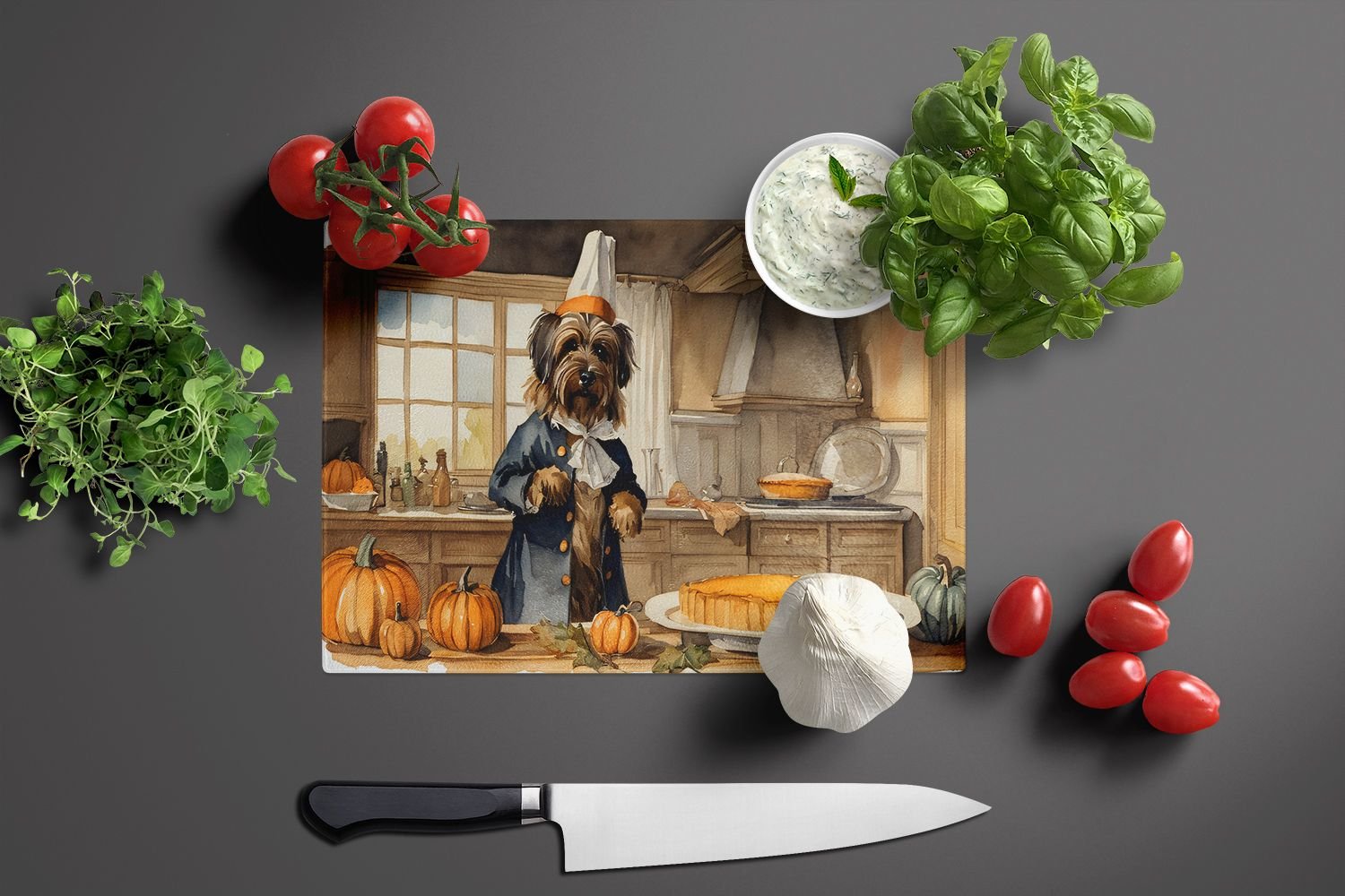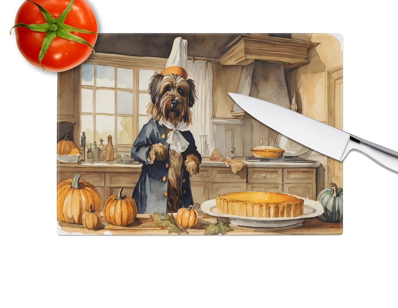Glass Cutting Board featuring breed specific Briard artwork. Celebrate Halloween with this Halloween Cutting Board. Introduce your kitchen to the vibrant, large Decorative Glass Cutting Board from Caroline's Treasures. Crafted from resilient tempered glass, this board is not only a utilitarian necessity but also a colorful art piece. With its generous dimensions of 15 inches in height and 12 inches in length, it offers ample space for all your cutting needs. Every piece showcases captivating artwork from distinguished artists, bringing an aesthetic edge to your kitchen. Beyond its attractive design, this cutting board ensures your countertop stays pristine and unscathed, owing to its heat-resistant properties. Engineered with user convenience in mind, it features non-skid feet for stability, and rounded corners for additional safety. Its robust construction renders it virtually unbreakable, guaranteeing longevity. The board comes with protective feet bumpers, maintaining its position during use. This product is recommended to be hand washed only. Proudly printed and assembled in the United States, this cutting board exemplifies superior craftsmanship. With Caroline's Treasures' Decorative Glass Cutting Board, you're investing in a blend of functionality and artistic flair.