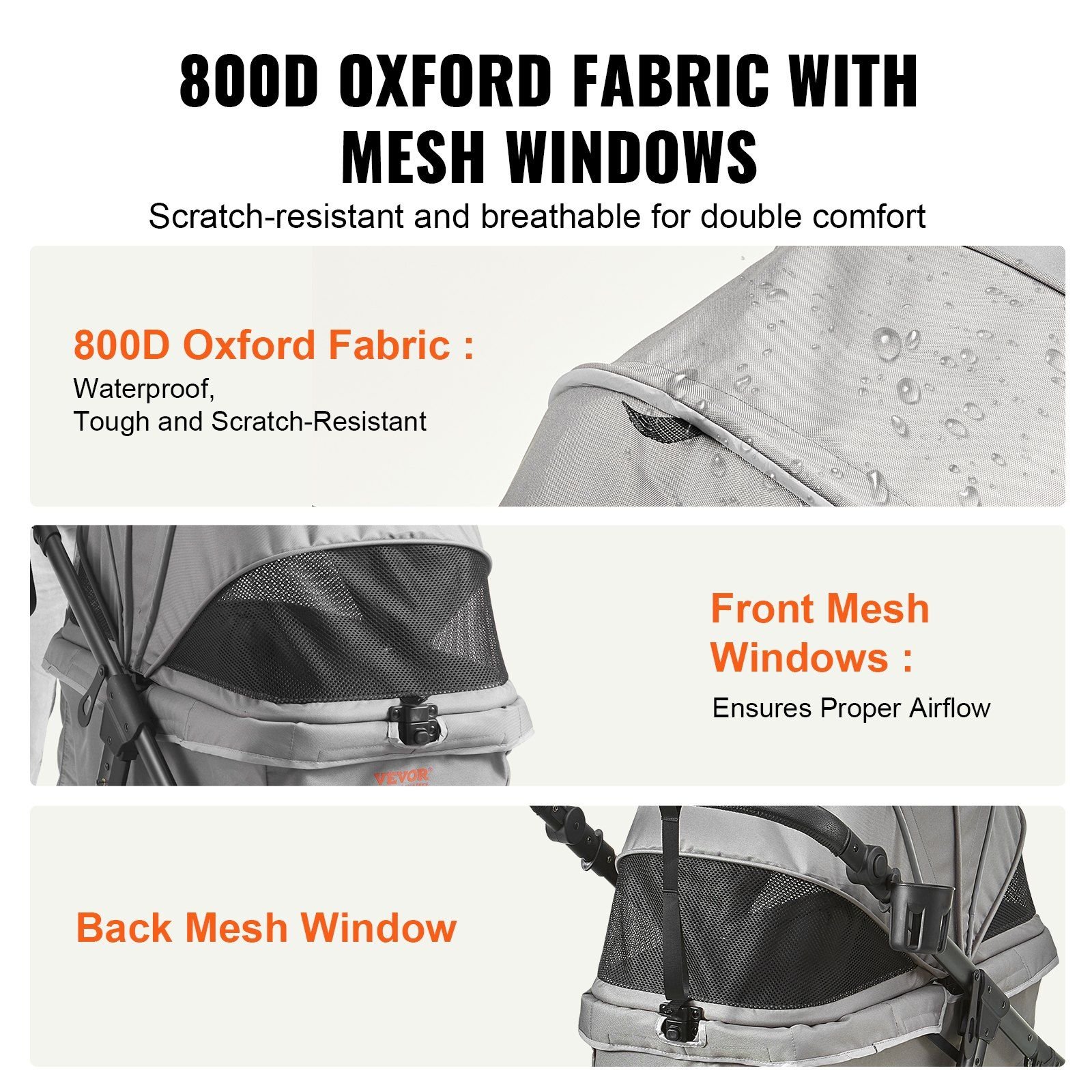 Multiple mesh windows of the dog stroller give your pet a wider field of vision and a closer connection to the outside world. The sturdy 800D Oxford fabric ensures the stroller can withstand the test of time, ensuring safety and comfort even when your pet gets playful.