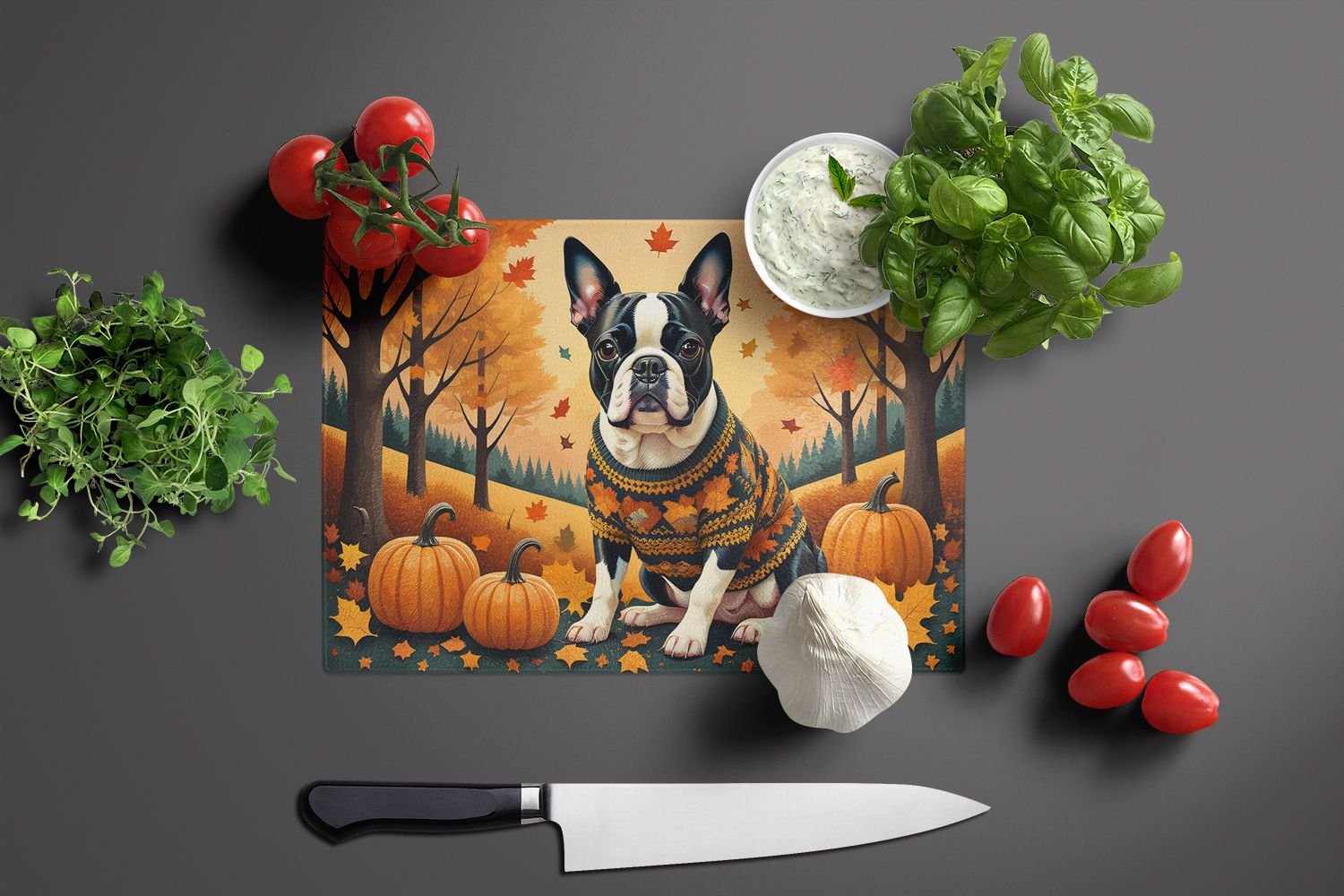 Home > NEW Boston Terrier Fall Glass Cutting Board Decorative Tempered Glass Kitchen Cutting and Serving Board Large Size Chopping Board