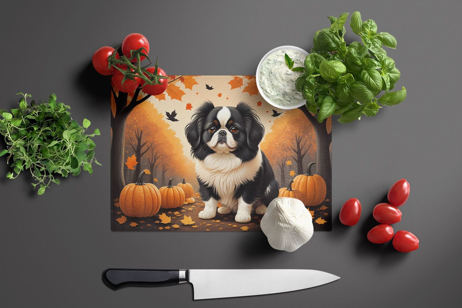 Glass Cutting Board featuring breed specific Japanese Chin artwork. Introduce your kitchen to the vibrant, large Decorative Glass Cutting Board from Caroline's Treasures. Crafted from resilient tempered glass, this board is not only a utilitarian necessity but also a colorful art piece. With its generous dimensions of 15 inches in height and 12 inches in length, it offers ample space for all your cutting needs. Every piece showcases captivating artwork from distinguished artists, bringing an aesthetic edge to your kitchen. Beyond its attractive design, this cutting board ensures your countertop stays pristine and unscathed, owing to its heat-resistant properties. Engineered with user convenience in mind, it features non-skid feet for stability, and rounded corners for additional safety. Its robust construction renders it virtually unbreakable, guaranteeing longevity. The board comes with protective feet bumpers, maintaining its position during use. This product is recommended to be hand washed only. Proudly printed and assembled in the United States, this cutting board exemplifies superior craftsmanship. With Caroline's Treasures' Decorative Glass Cutting Board, you're investing in a blend of functionality and artistic flair.